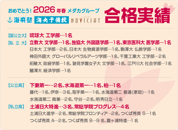 自分を過小評価しないでほしいと思います。頑張れば全て上手くいくとは言いませんが、何事にも挑戦することで新しい道が開けます。受験生活の中で、厳しい言葉をかけられたり、辛い現実に直面することもあると思いますが、そんな時こそ、自分だけでも自分を評価してあげましょう。中学、高校生活は長いようでとても短いです。大切な「自分探し」の期間、ぜひ色々な事に挑戦し、自分の可能性を広げてみてください。