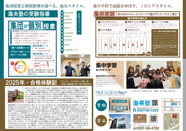 ぼくは今まで、自力で勉強していました。中学1年生まではそれでよかったのですが、中学2年生になるとだんだんと勉強が難しくなっていき、成績も下がる一方でした。夏休みに塾に行こうかと親から話があり、自分も成績が下がるのは嫌だったので、どこの塾に行くか考えました。そこでチラシを見て、個別の塾が嫌だったので、ノビシアにしようと思いました。ノビシアのチラシには、自分がいいなと思うことがたくさん書いてあり、自分に合っていると思います。通ってみると、自分の苦手なところ、不安なところをしっかりと教えてくれて、自分に合ったプランのようなものを考えてくれました。ぼく自身も先生に言われたところをしっかりやりました。するとテストでいい点をとれるようになりました。ノビシアは、勉強も教えてくれるけど、自分で勉強がやりやすいようにしてくれる塾だとぼくは思いました。